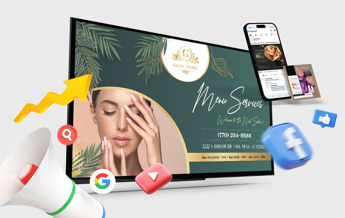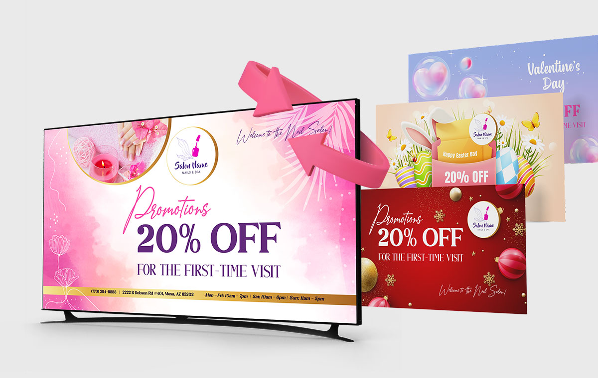 Our platform offers unmatched compatibility, working seamlessly with a wide range of display devices including TVs, tablets, projectors, large LED panels, and even outdoor digital billboards. This flexibility ensures that you can showcase your content in virtually any environment, whether it’s indoors or outdoors, in a small nails salon or a large retail space.